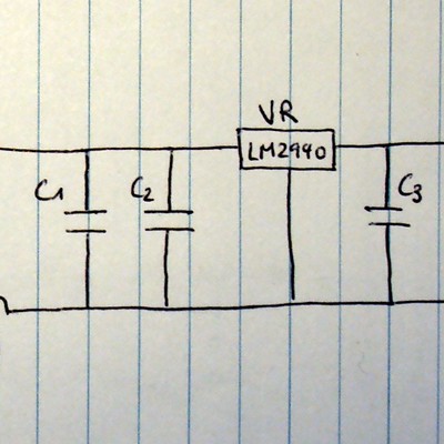 If you are wondering where C2 and C3 come from, they are specified in the LM2940 datasheet and are required for the voltage regulator to work correctly. If you use a different voltage regulator, you will probably need capacitors with different values.