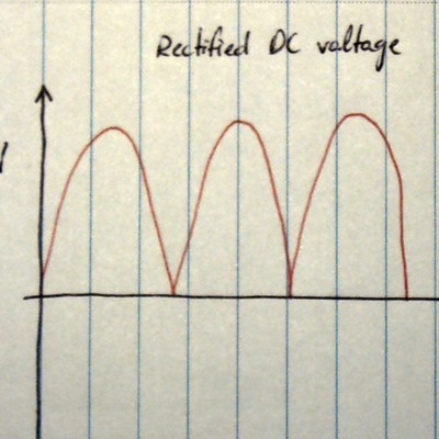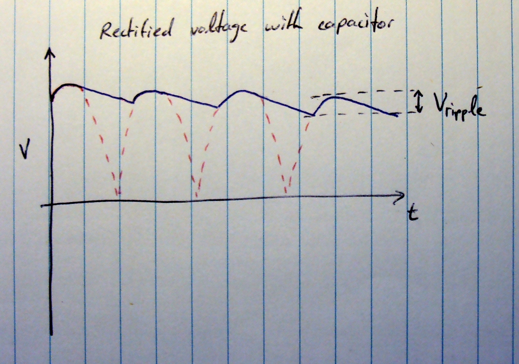 The cruising scenario is probably the lowest speed the charging circuit should work at. We need to make sure that the ripple voltage in Eqn. 1 stays acceptably low. The frequency of the alternating current produced is by my dynamo can be calculated as follows: