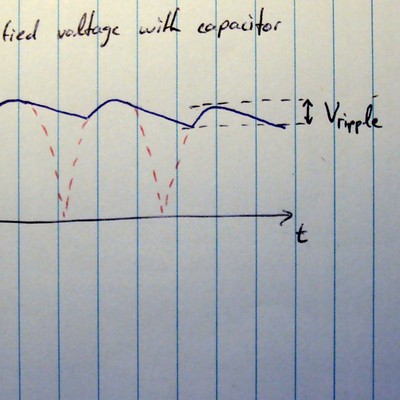 After adding a shunt capacitor across the regulated DC line and ground, we obtain a voltage like the one shown in the picture above. The remaining ripple in the DC voltage can be seen in the diagram above. We want to reduce this as much as possible to safeguard delicate phone electronics! This is can be accomplished by changing the capacitor value as we will see.